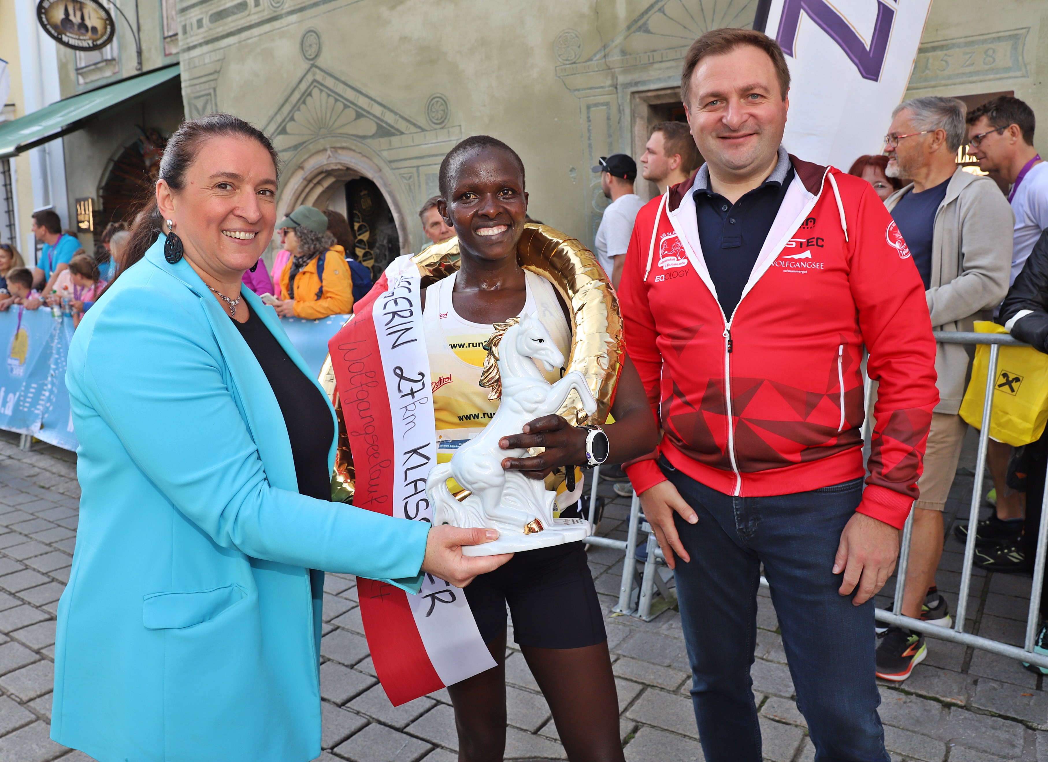 Von der Rössl-Wirtin Gudrun Peter gibt´s für die Top-3-Damen und -Herren jeweils das „Weisse Rössl“ – rechts Franz Eisl (Bgm. St. Wolfgang).