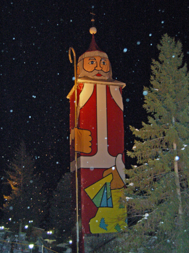 Zurzeit ist St.Niklaus tief verschneit. Attraktion ist der größte Nikolaus der Welt. Dominique Gruber hatte am 05. Dezember 1998 die tolle Idee, den Kirchturm als Nikolaus zu verkleiden. Er ist 36,8 Meter hoch und er steht im tiefsten Tal der Schweiz. Das Tal hat einen Höhenunterschied von 3768 Metern zwischen der Talsohle Nikolaital (777 m. ü. M.) und dem Dom, mit 4545 m. ü. M. nur einer 29 Viertausendern in der Region.