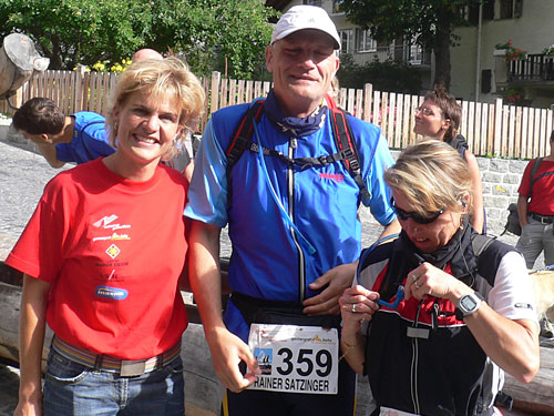 Maria und Rainer werden in St. Niklaus von Andrea Kummer, der Geschäftsführerin des Vereins Zermatt-Marathon, begrüßt. Dann genießen sie den herrlichen Lauf entlang der Vispa, durch Zermatt und schließlich nach Sunegga, der unbeschreiblich schönen "Aussichtsterrasse" von Zermatt. Über Riffelalp geht es dann extrem steil hinauf nach Riffelberg ins Ziel. Maria, das Leichtgewicht, ist am Schluss nicht mehr zu halten. Im Alleingang bewältigt sie die letzten Kilometer und feuert dann kurze Zeit später Rainer beim Zieleinlauf noch einmal kräftig an. Zufrieden mit ihrer Leistung und begeistert von der Strecke nehmen sie die Medaille und das tolle Finisher-Shirt in Empfang.