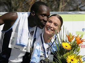Wie schon letztes Jahr mit zwiespältigen Gefühlen hatte Claudia Oberlin (im Bild rechts mit dem Sieger Stanley Leleito) umzugehen. Die 26-jährige, derzeit beste Schweizer Marathonläuferin gewann zwar zum ersten Mal eine Prüfung über die 42,195 km, sie verpasste aber mit ihrer Zeit von 2:34:39 den geforderten Wert für eine WM-Teilnahme (2:33:00) klar. Und sie blieb auch 30 Sekunden über ihrer letztjährigen Bestmarke, mit der sie die Olympia- Qualifikation ebenfalls verpasst hatte. «Es tut in der Tat weh, wieder an der Limite vorbeigelaufen zu sein, andrerseits bedeutet mir dieser Sieg enorm viel», bilanzierte sie. Als Grund für ihr Scheitern machte sie «eine Verkrampfung im Kopf zwischen Kilometer 20 und 30» aus. Erst als ihr die Begleiter rieten, die Zeit zu vergessen, löste sich der Knopf und lief sie einen starken Schluss.